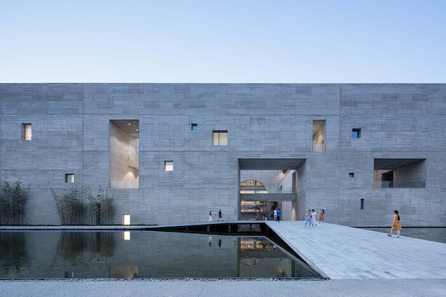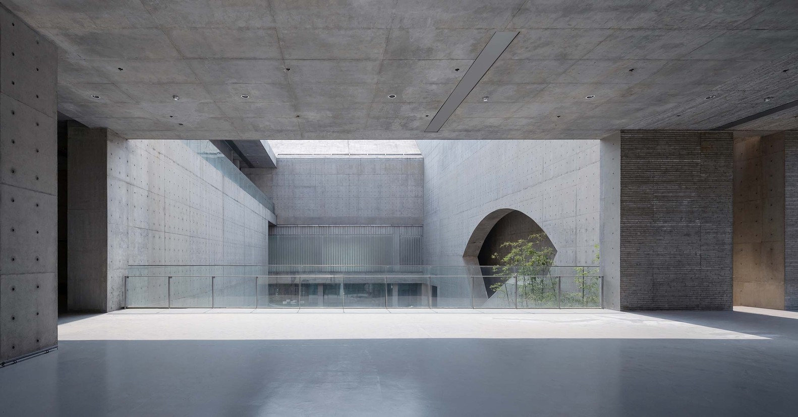 壽縣文化中心采用清水混凝土建設(shè)而成,內(nèi)設(shè)多個(gè)尺度各異的院落被置于相對(duì)方正、封閉的矩形塊之中,一條蜿蜒起伏,時(shí)上時(shí)下的公共廊道將它們串聯(lián)起來。每一個(gè)功能擁有兩到三個(gè)內(nèi)院,建筑主入口的前院尺度較大,形成了一個(gè)公共廣場(chǎng),意味著壽縣民居中的前院和“堂屋”,建筑后部的后院又有著壽縣民居中“后花園”的味道。這條漫游環(huán)道,引導(dǎo)著人們緩步橋上,穿越水面,步入建筑之中。從前院開始,在不打斷室內(nèi)連續(xù)性的前提下,人們可以穿梭游覽于,布滿了很多內(nèi)院的整個(gè)建筑。沿著這個(gè)可遮陽避雨的環(huán)形廊道,參觀者時(shí)而在一層,時(shí)而又到了二、三層,空間變幻莫測(cè),光影時(shí)明時(shí)暗,去探索發(fā)現(xiàn)令人意想不到的驚喜,感悟“藏、息、修、游”所賦予中國傳統(tǒng)建筑的藝術(shù)精神。