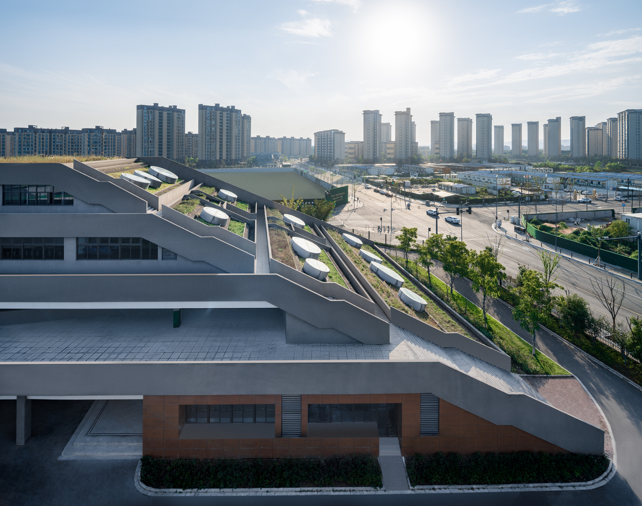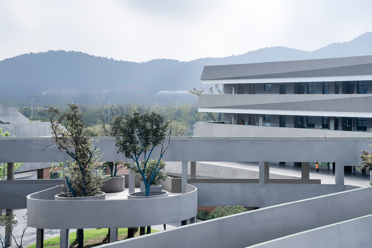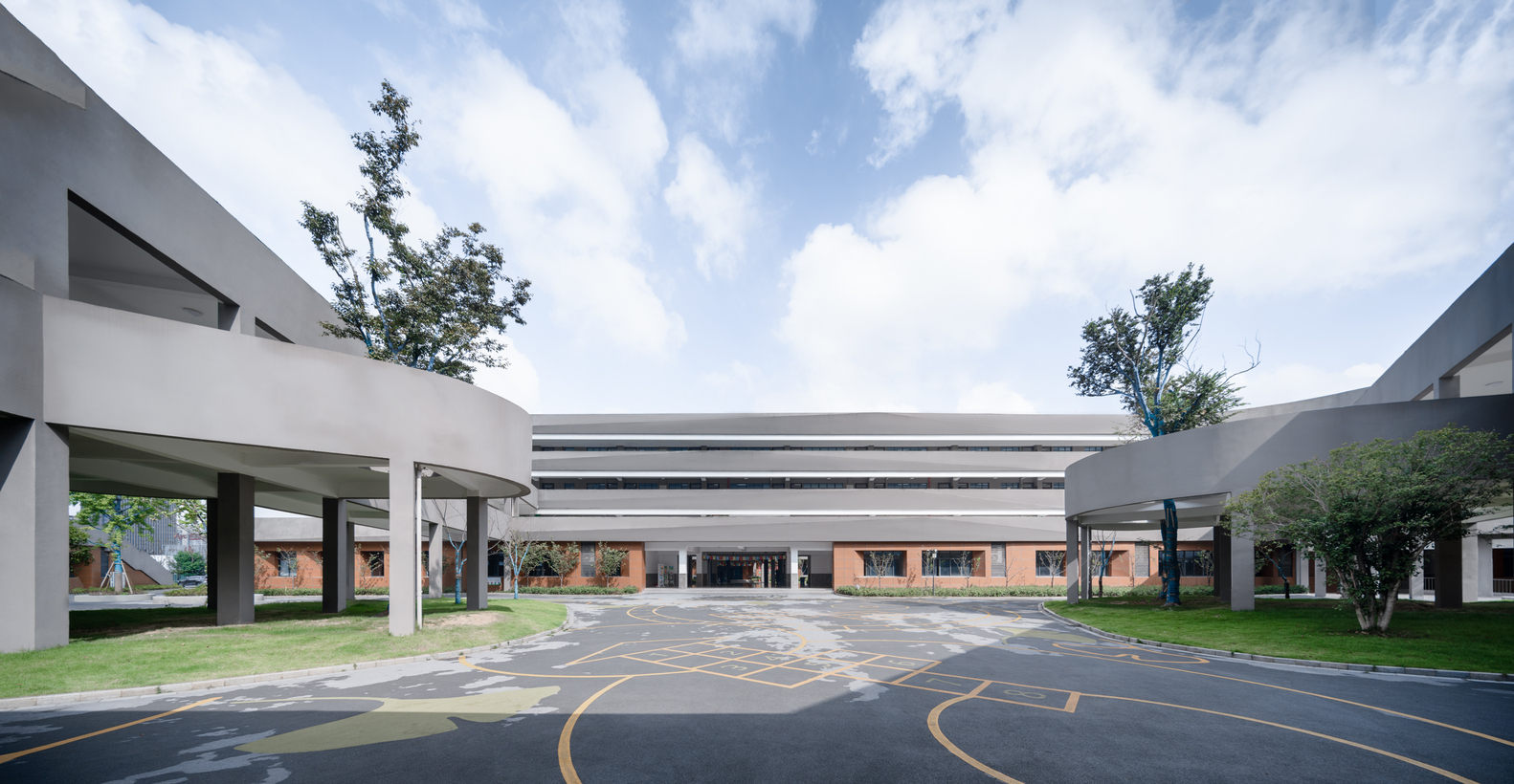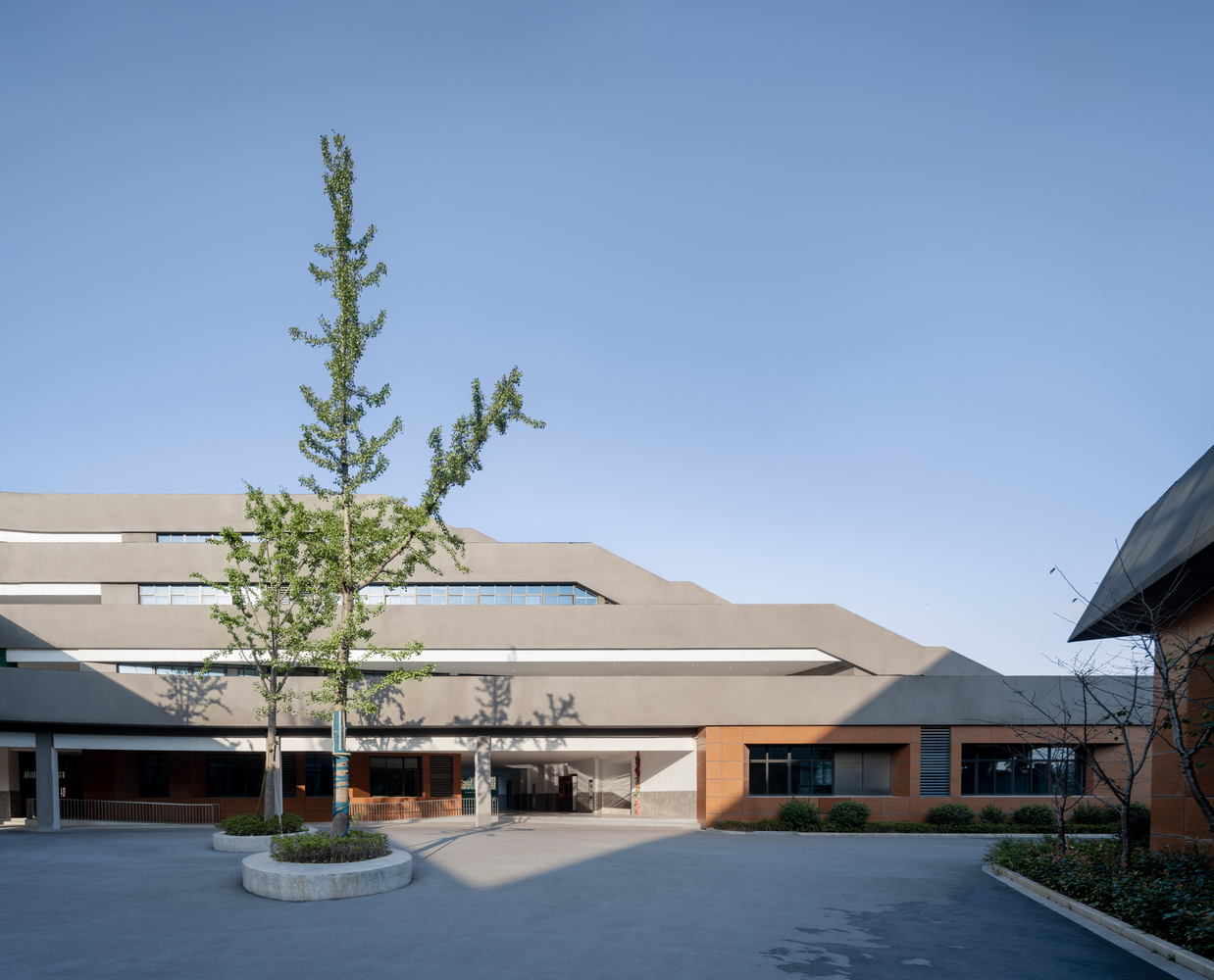 西南小學(xué)位于中國·浙江湖州經(jīng)濟(jì)開發(fā)區(qū),校園的北側(cè)為社會公園,南側(cè)隔河而望連綿漸隱的天目山脈。西南小學(xué)就選址于這山城之間,乘著這山水的靈秀,開始一段“巡檐風(fēng)與月,隱幾水兼山”的建造之旅。建筑的的造形十分的奇特,以天目山的“目”字為結(jié)構(gòu),風(fēng)格也十分的新穎,建筑外表皮采用清水混凝土掛板打造,以全新素顏面貌與遠(yuǎn)處的天目山合諧的融為一體。