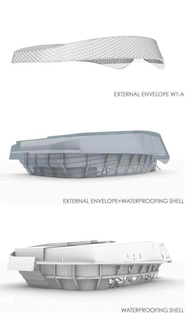 并以足球上的六邊形作為立面藍(lán)本,加以演繹,形成極具美學(xué)的幕墻圖案。設(shè)計采用雙層表皮結(jié)構(gòu),內(nèi)部為高性能的防水混凝土,外部為“拉法基UHPC”幕墻板及鋁制格柵,抵擋風(fēng)雨的同時,構(gòu)建出堅固且兼具曲線律動的體驗館。