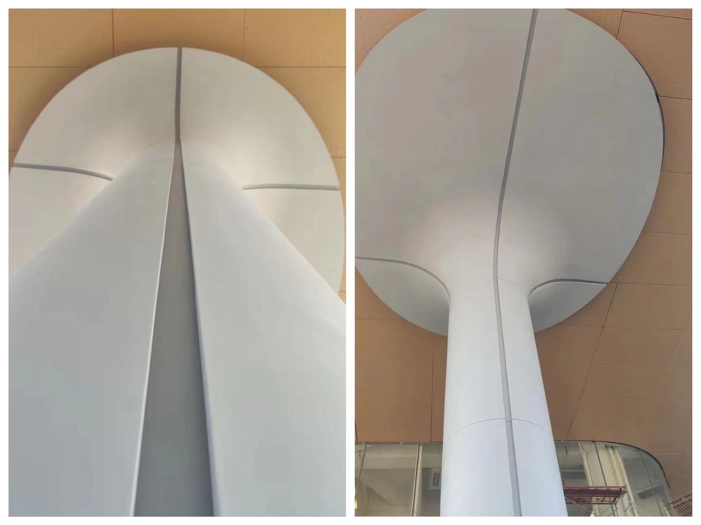 項(xiàng)目前場總高10米的曲線景觀柱,采用“砼創(chuàng)牌”25MM厚度的UHPC超高性能混凝土預(yù)制而成,為了達(dá)到最佳的視覺效果,使用拉法基Ductal品牌粉料,柱狀體塊一次脫模成型。與傳統(tǒng)混凝土粗笨厚重等的特點(diǎn)不同,UHPC依仗著自身強(qiáng)悍的物理特性,可以將結(jié)構(gòu)極度的輕量化,具有強(qiáng)烈的視覺美感、表面光潔度高、質(zhì)地細(xì)膩、有溫潤如玉的質(zhì)感。