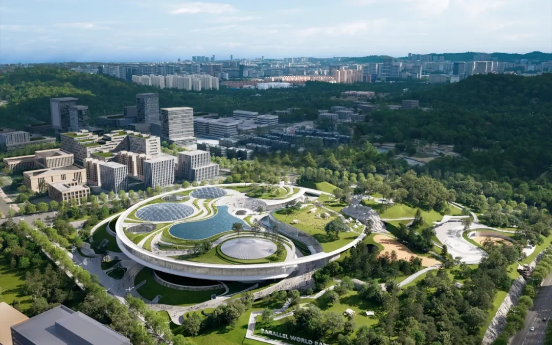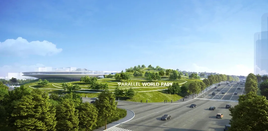 項目設(shè)計理念是以“平行世界”為概念,通過構(gòu)建一個互為“鏡像”的空間,隱喻虛擬與現(xiàn)實之間的關(guān)系。為了融入周圍的山體環(huán)境和自然地貌,設(shè)計采用了無方向性的“圓”形,使其消隱于大地景觀之中。