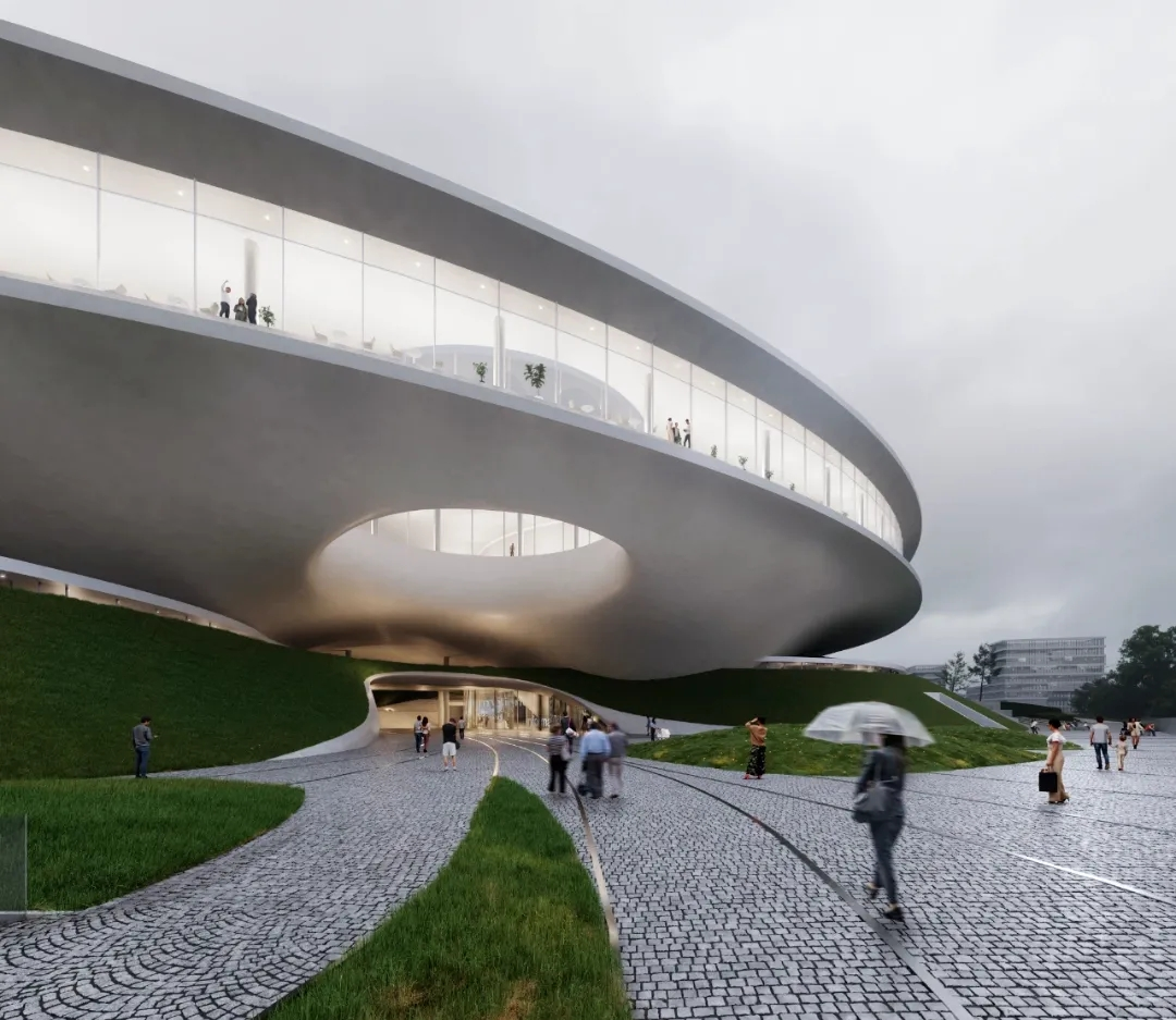 一二層被設(shè)計為城市綠丘,與底層整體架空,為現(xiàn)實的城市空間提供一個立體市民公園。參觀者可以從城市步行至建筑中心,然后抵達(dá)山頂。在這里,創(chuàng)享中心的展覽、會議、配套及其他設(shè)施都被巧妙地連接在一起。三四層則是一個看似從未知星際的太空飛碟坐落山間的懸浮空間,內(nèi)部包含主展館和會議中心。這個外部環(huán)形且內(nèi)無邊界的設(shè)計,擁有極高的靈活性,可以為虛擬現(xiàn)實展品提供隨心所欲的展示場地。
