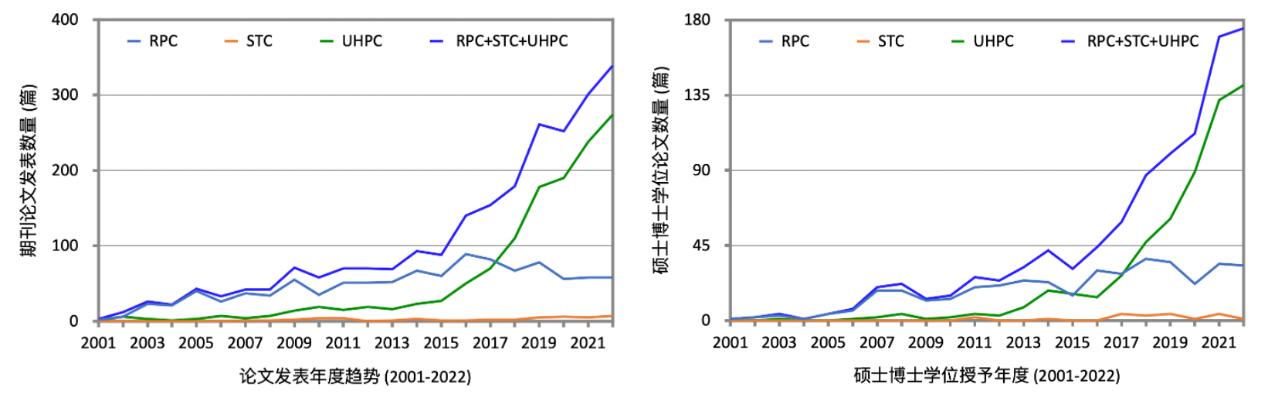 在中國知網(wǎng)(cnki.net)上,以“超高性能混凝土+UHPC”、“活性粉末混凝土+RPC”和“超高韌性混凝土+STC”(在中國使用的三個名稱)為主題詞,分別查詢過去二十年(2001-2022)每年在中文期刊發(fā)表的論文數(shù)量和碩士博士論文年度數(shù)量增長趨勢見圖1a和1b。