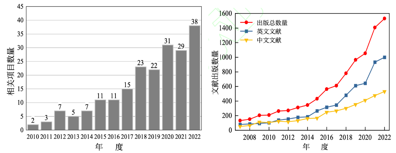 (a)中國年度國家項目數(shù)量趨勢 (b)年度中英文文獻(xiàn)數(shù)量趨勢