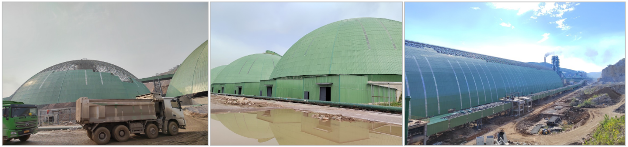 華新陽新億噸機(jī)制砂石工廠是全球最大、最先進(jìn)的機(jī)制砂生產(chǎn)系統(tǒng),生產(chǎn)流程短、運行穩(wěn)、能力大,能耗低于行業(yè)平均的30%以上,配套建設(shè)了綠色礦山和智慧物流。球形堆棚和生產(chǎn)線的封閉傳統(tǒng)上采用玻璃纖維增強(qiáng)塑料板(玻璃鋼),但耐候性不足,使用壽命較短。為此,華新超可隆使用UHPC材料開發(fā)和生產(chǎn)了高韌性、高耐久的屋面瓦和墻面板產(chǎn)品,并在陽新億噸機(jī)制砂石項目上應(yīng)用(見圖36),總面積高達(dá)347,000m2。