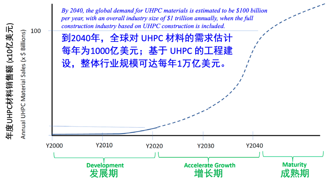 2023年中國在UHPC領(lǐng)域的多個方面取得重要進(jìn)展,發(fā)展勢頭良好,UHPC的價值也被更好地認(rèn)識到,并得到越來越多、越來越好地利用。那么,UHPC未來會有怎樣的發(fā)展?在美國UHPC 2023國際研討會上,加拿大V.H.(Vic) Perry先生作出了判斷“The Future of Ultra-High Performance Concrete(UHPC的未來)”[16]。他使用喬布斯(Steve Jobs)的書中所提供的突破性技術(shù)市場發(fā)展基本規(guī)律——S形發(fā)展曲線,預(yù)測UHPC市場發(fā)展,認(rèn)為“到2040年,全球?qū)HPC材料的需求估計每年為1000億美元;基于UHPC的工程建設(shè),整體行業(yè)規(guī)模可達(dá)每年1萬億美元”(見圖39)。