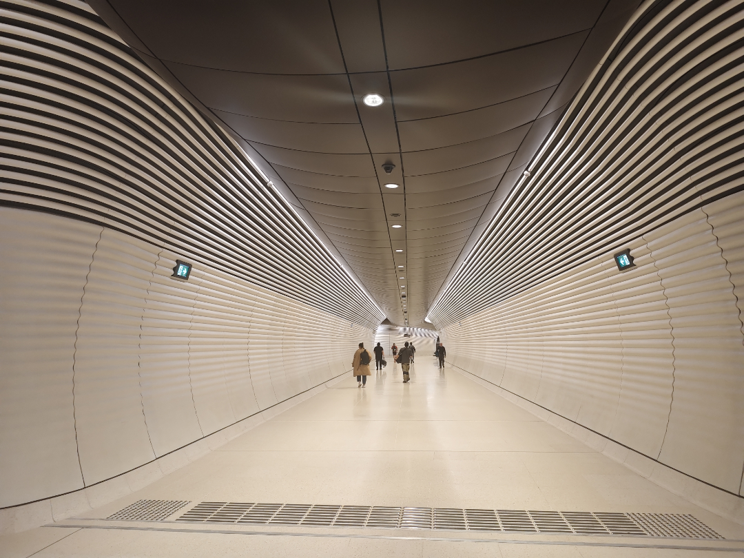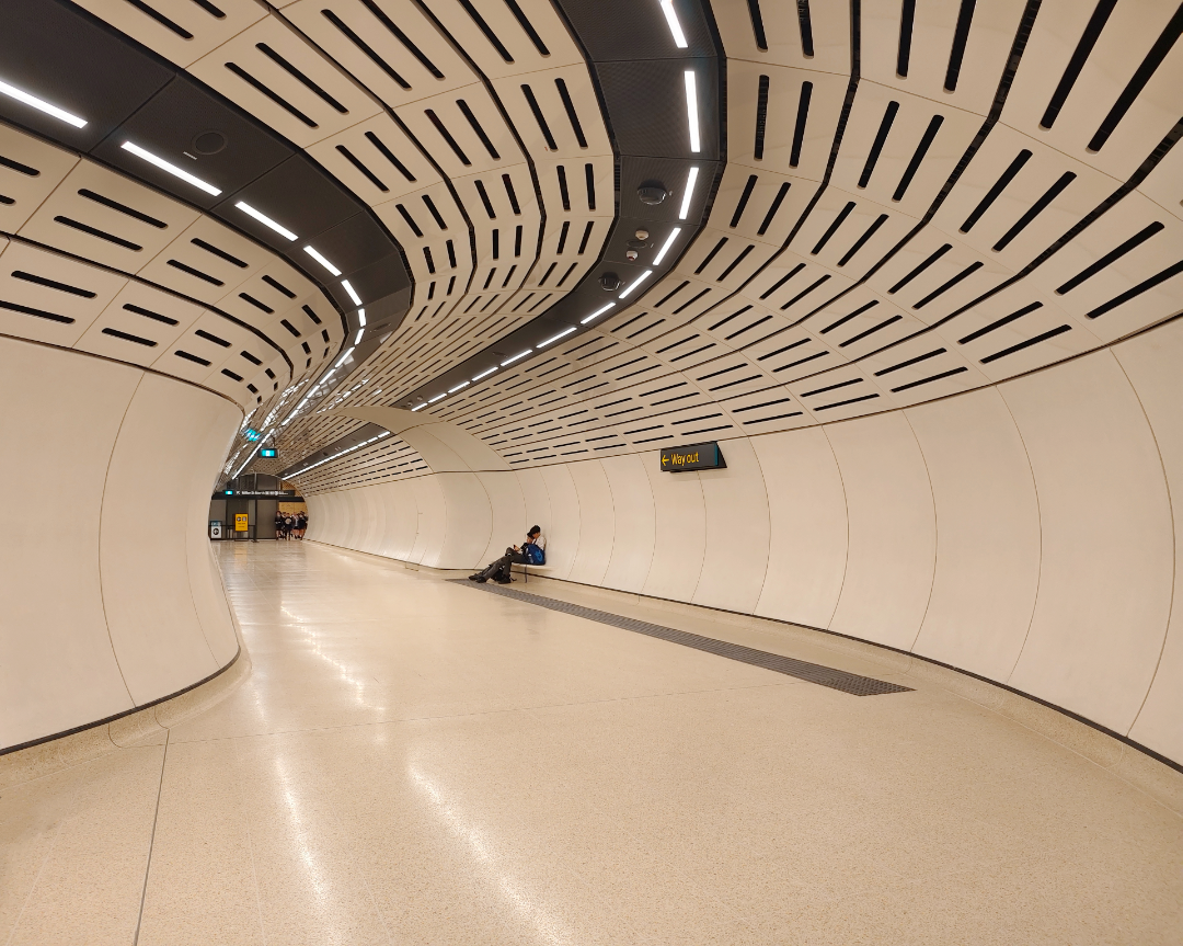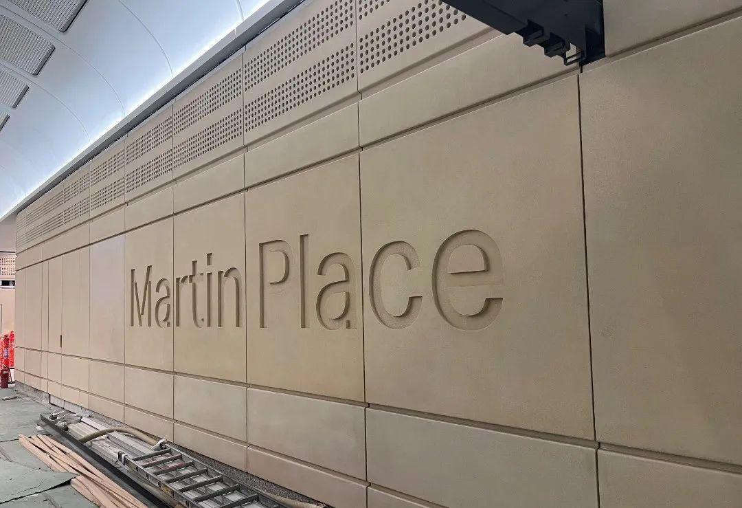 Martin Place站是悉尼地鐵的標(biāo)志性站點,項目同樣也是采用GRC幕墻材料,其裝飾設(shè)計體現(xiàn)了GRC材料的技術(shù)創(chuàng)新。車站采用大尺度GRC曲面吊頂尤為引人注目,通過精確的模具制作和安裝技術(shù),營造出美觀的整體效果,進一步提升了材料的性能和表現(xiàn)力。GRC材料的輕質(zhì)特性使得大跨度吊頂成為可能,同時其良好的聲學(xué)性能提升了車站的聲環(huán)境質(zhì)量。