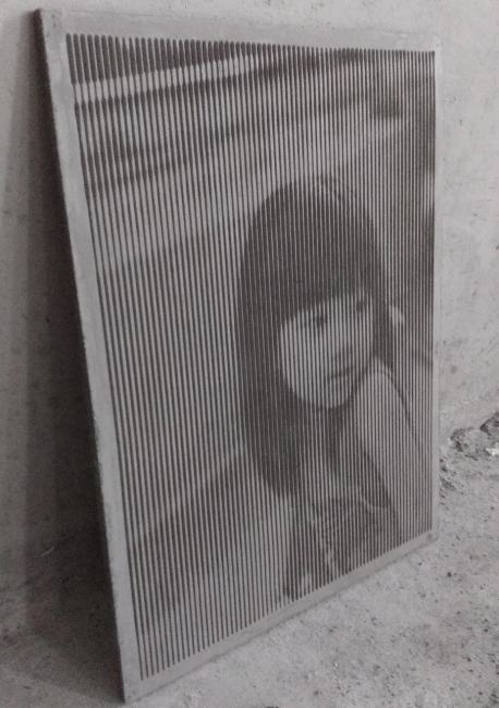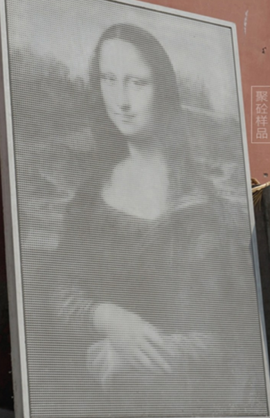 原理:將圖片轉(zhuǎn)化成灰度圖,再用專門軟件處理成CNC雕刻指令,在木板上打點(diǎn)或刻槽制作成母模,再用模具轉(zhuǎn)印到混凝土表面形成圖案。由在光照條件下凹槽或凹點(diǎn)內(nèi)的寬窄不同、深淺不一的陰影與基板顏色共同形成表面圖像,隨著光線角度不同和觀察角度不同,圖案呈現(xiàn)動(dòng)態(tài)效果。