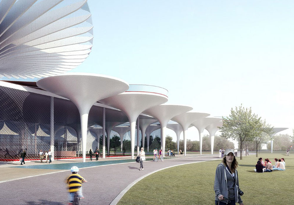 設(shè)計理念:以生態(tài)、開放、景觀化為設(shè)計理念,以傘狀結(jié)構(gòu)為建筑基礎(chǔ)單元,單個傘狀單元偏景觀化,形態(tài)鮮明;圓形段棚形成的底部空間,開放自由與環(huán)境高度融合。多個傘狀單元相鏈接,變可構(gòu)成連續(xù)的鮮明的內(nèi)部空間。