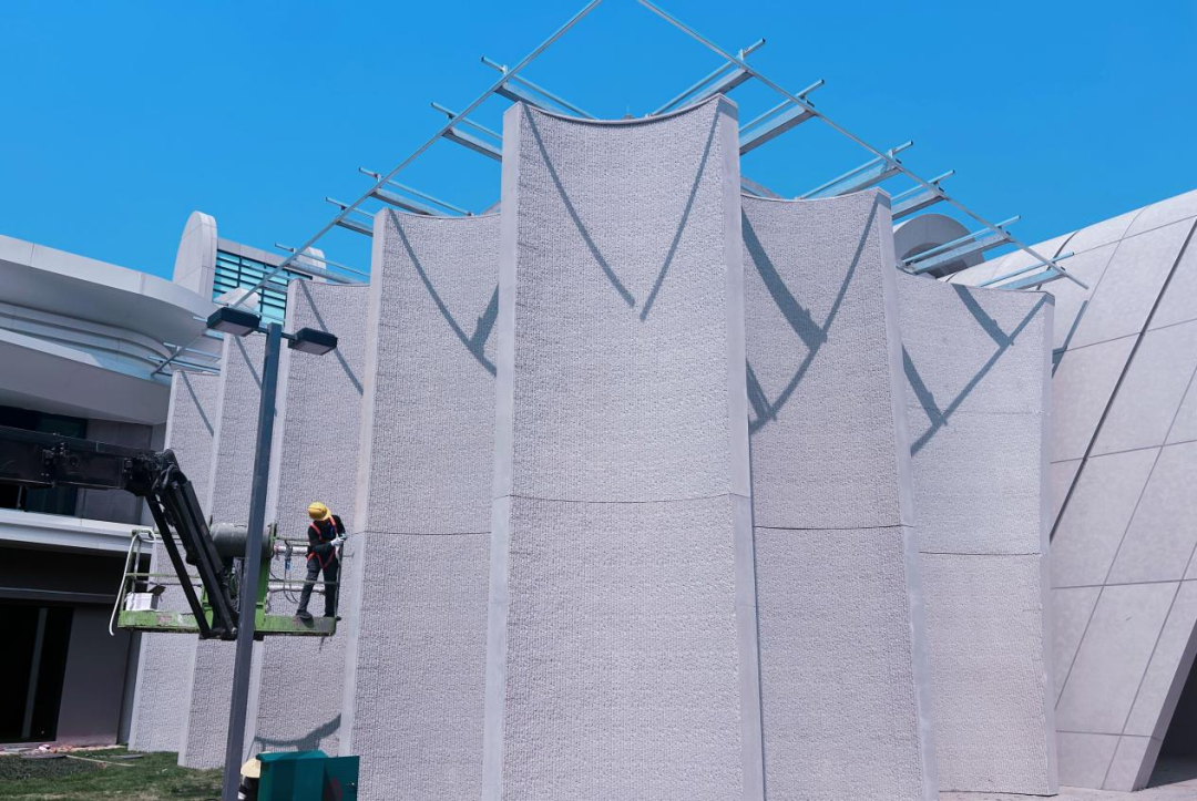 本項目采用的是剔鑿條紋效果的UHPC曲板,它通過模擬手工剔鑿的紋理,增強了面板的立體感、原始感。UHPC超高性能混凝土材料不僅能提升建筑外觀的藝術(shù)性和觀賞性,更通過其卓越的耐久性和穩(wěn)定性為建筑提供長期的保護(hù)。